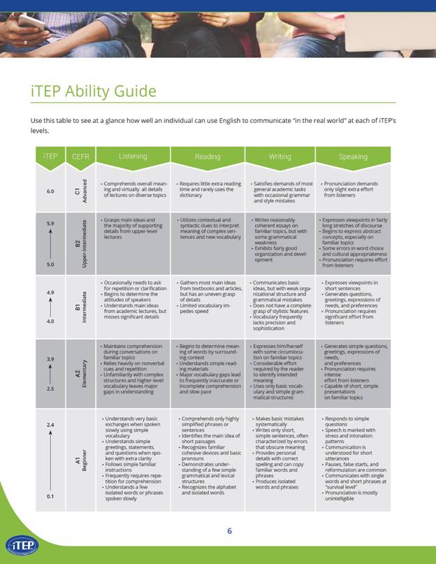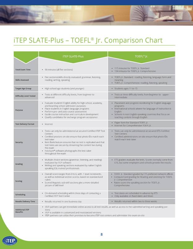 - Comprehensive iTEP SLATE assesses five core skills plus a variety of linguistic sub-skills, giving you a detailed and useful score report.