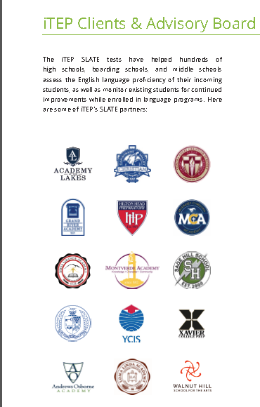 iTEP SLATE (Secondary Level Assessment Test of English) is the most comprehensive tool for high schools, middle schools, and academies to measure the English proficiency of incoming ESL students and monitor the language development of students in existing English programs. iTEP SLATE is efficient, secure, accurate, affordable, and designed to meet the needs of young learners. In short, the iTEP SLATE is right for you because it is: